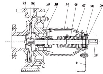 RY熱油泵泵頭主要由殼體、轉(zhuǎn)子、軸承、密封等部分組成,采用的密封結(jié)構(gòu)為填料密封,其中重要的一點是,為了起到輔助密封的作用,特別加了耐溫油封,這樣可以使泵體接觸更高的介質(zhì)溫度并正常運轉(zhuǎn)。泵與電動機采用三爪型彈性聯(lián)軸器聯(lián)接,如用戶有特殊需求,可配備其他類型聯(lián)軸器。
